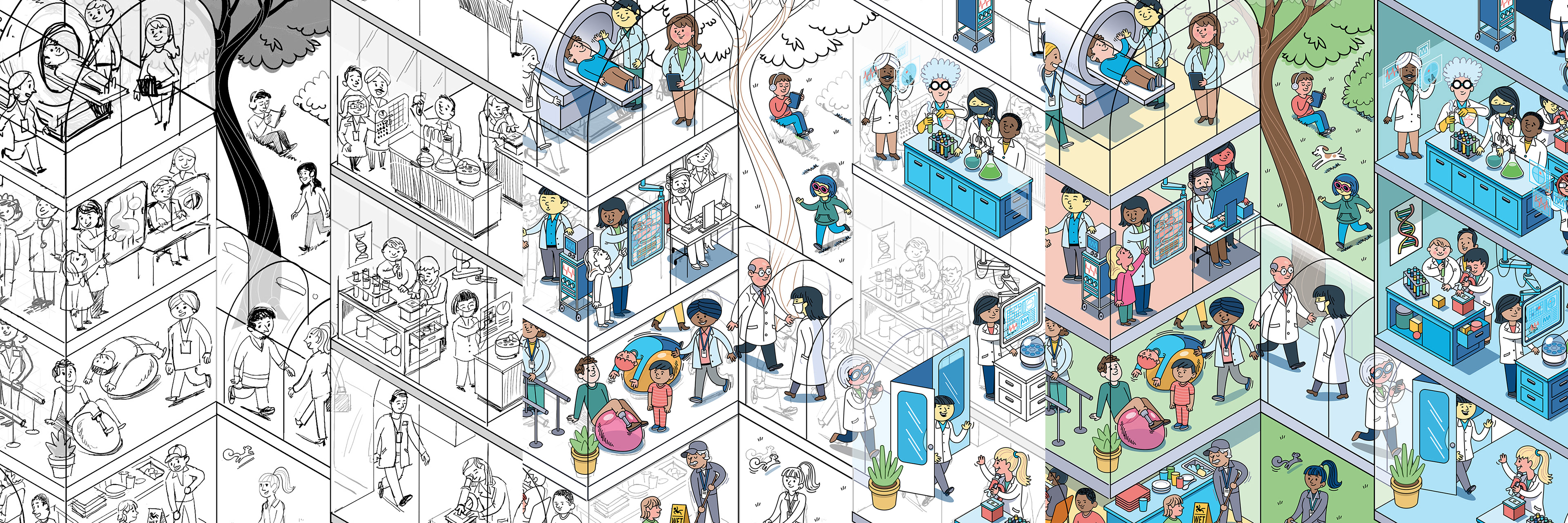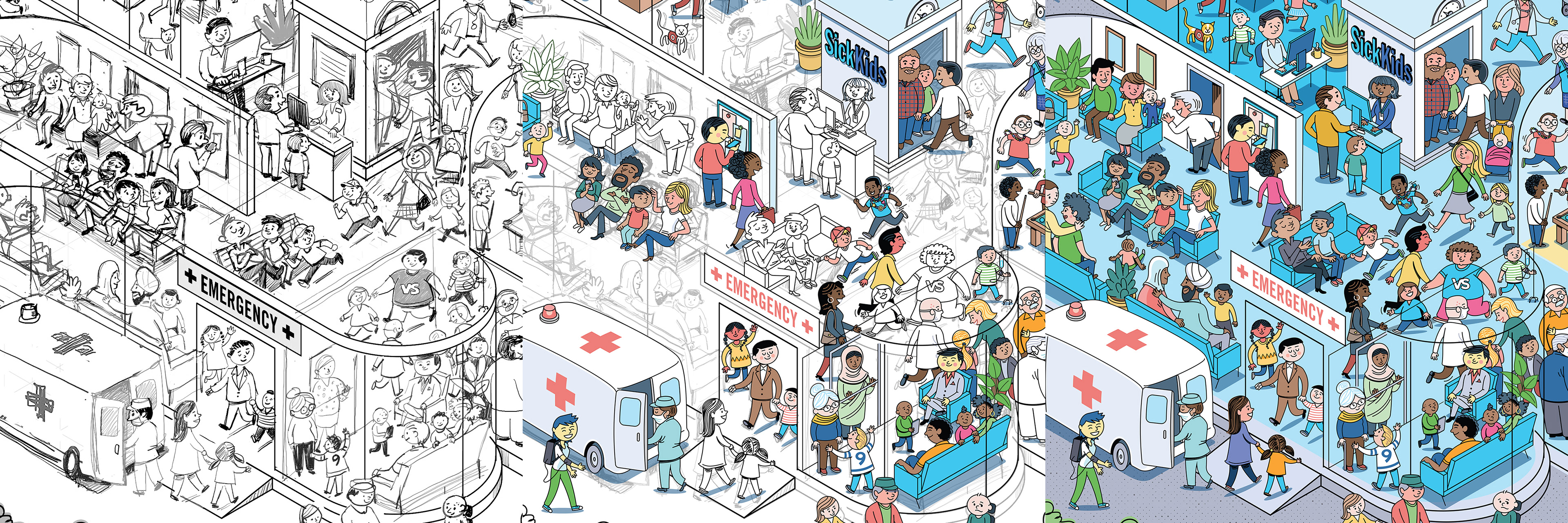 We thoroughly enjoyed every aspect of working on this search and find mural for Sick Kids Hospital. Had a blast working with their wonderful staff and learning more about the hospital and the work they do. It’s been very well received. Patients and staff alike are having fun looking for all the hidden easter eggs!